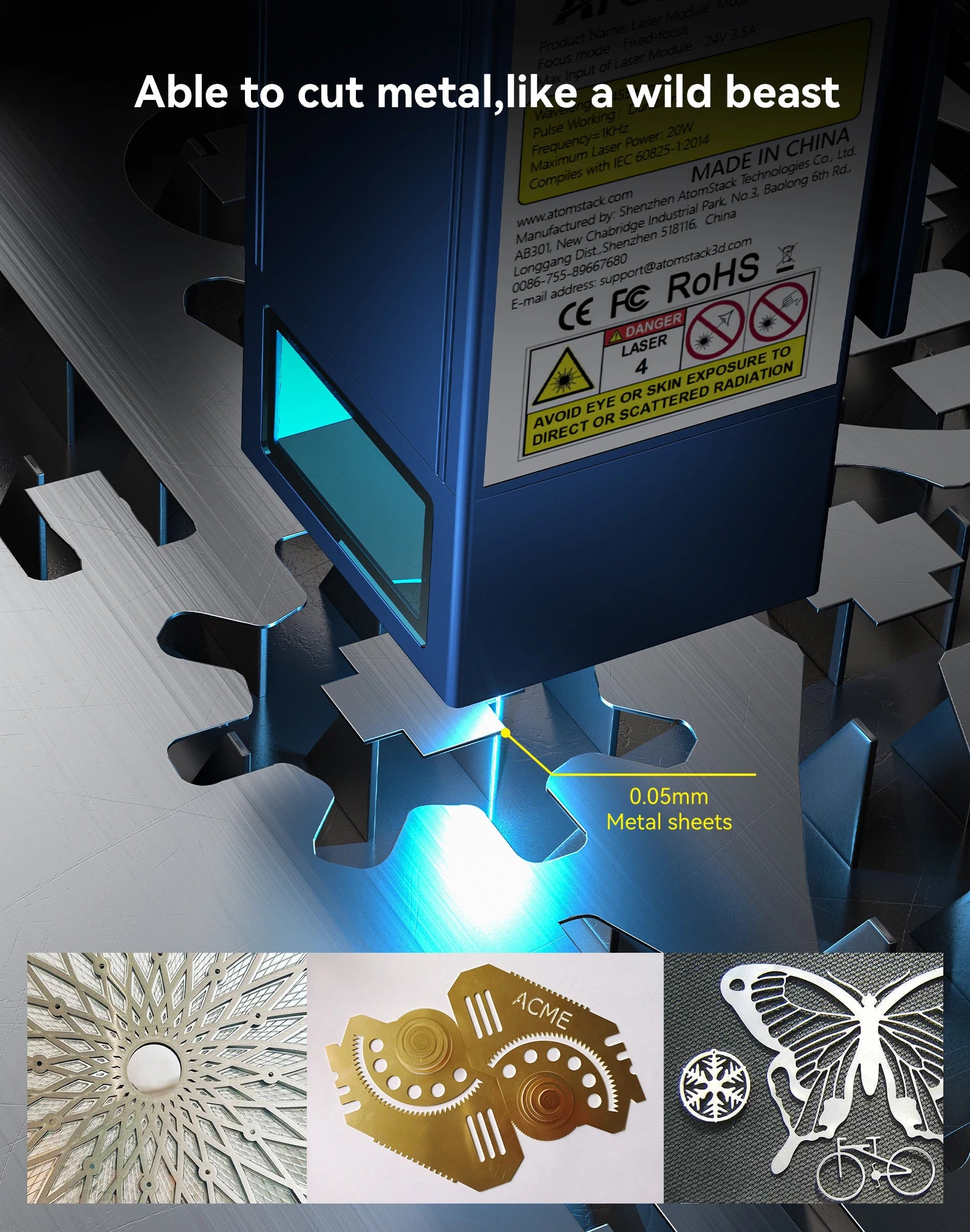 1. Unprecedented Power: The world's first laser engraver boasting a 20W optical power. With a cutting-edge combination of four 6W lasers, it effortlessly cuts through 12-15mm thick tungsten and 8mm thick acrylic in a single pass, and can even handle 0.05mm stainless steel.