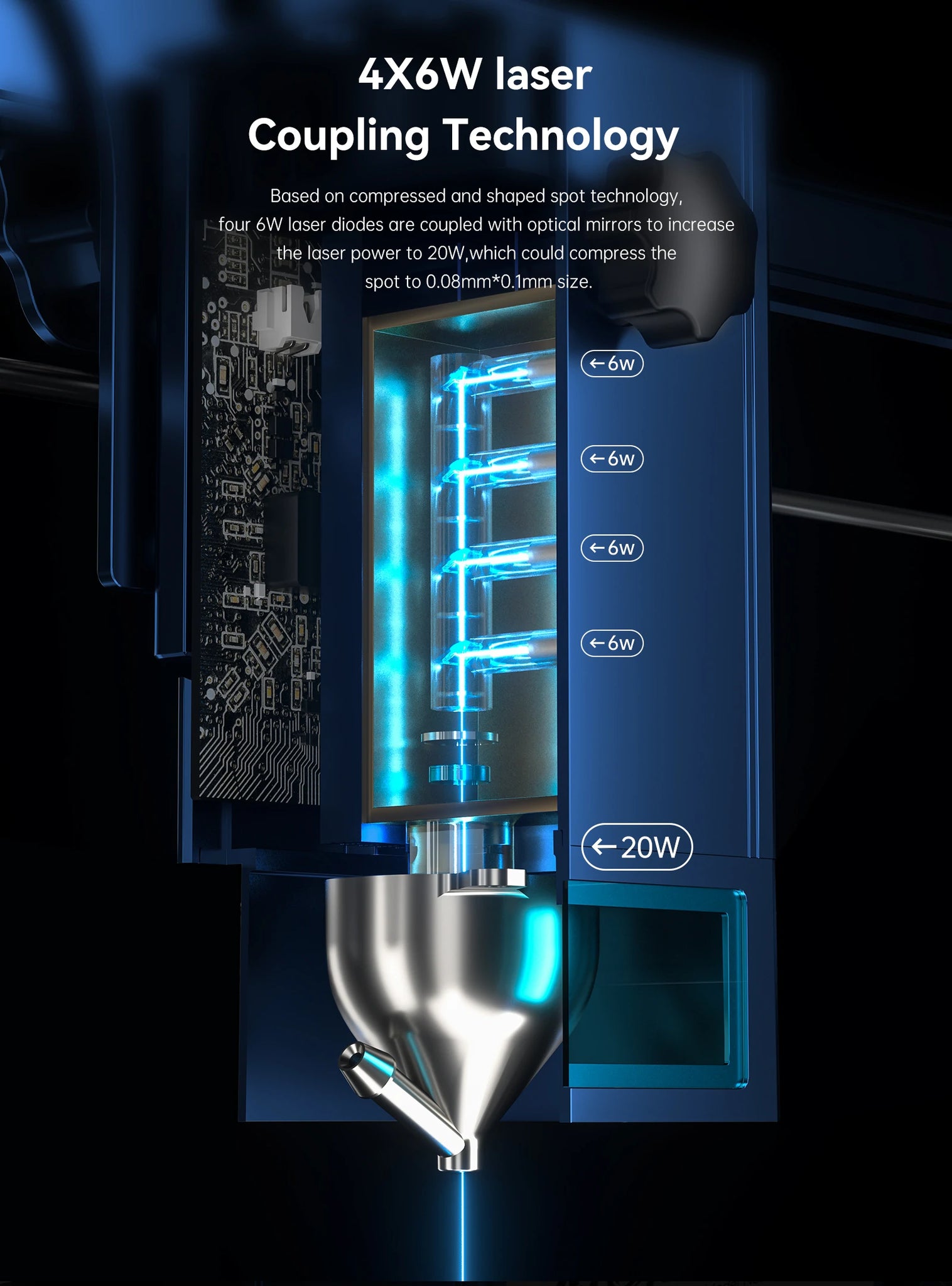 1. Unprecedented Power: The world's first laser engraver boasting a 20W optical power. With a cutting-edge combination of four 6W lasers, it effortlessly cuts through 12-15mm thick tungsten and 8mm thick acrylic in a single pass, and can even handle 0.05mm stainless steel.