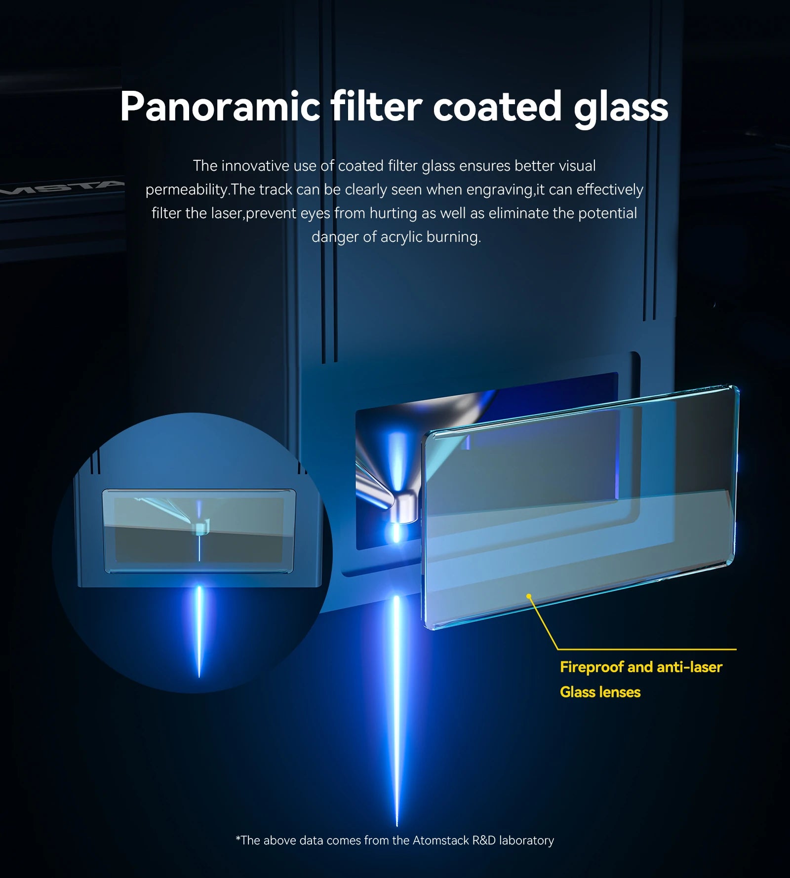 6. Eye-Protection Redefined: Our panoramic filter glass cover shields eyes effectively, blocking 97% of UV light. No more goggles; observe your engraving in real-time, safely.