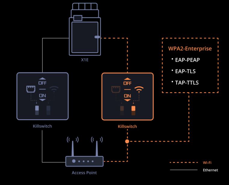 The X1E offers the option to connect to your devices through its newly added Ethernet port, ensuring robust network communication in complex environments. Ethernet connectivity can also be used in crowded wireless signal environments. Additionally, the X1E provides WPA2-Enterprise Wi-Fi Authentication (EAP-PEAP/EAP-TLS/TAP-TTLS) and individual physical kill switches for both Wi-Fi and Ethernet, meeting stringent network security requirements.